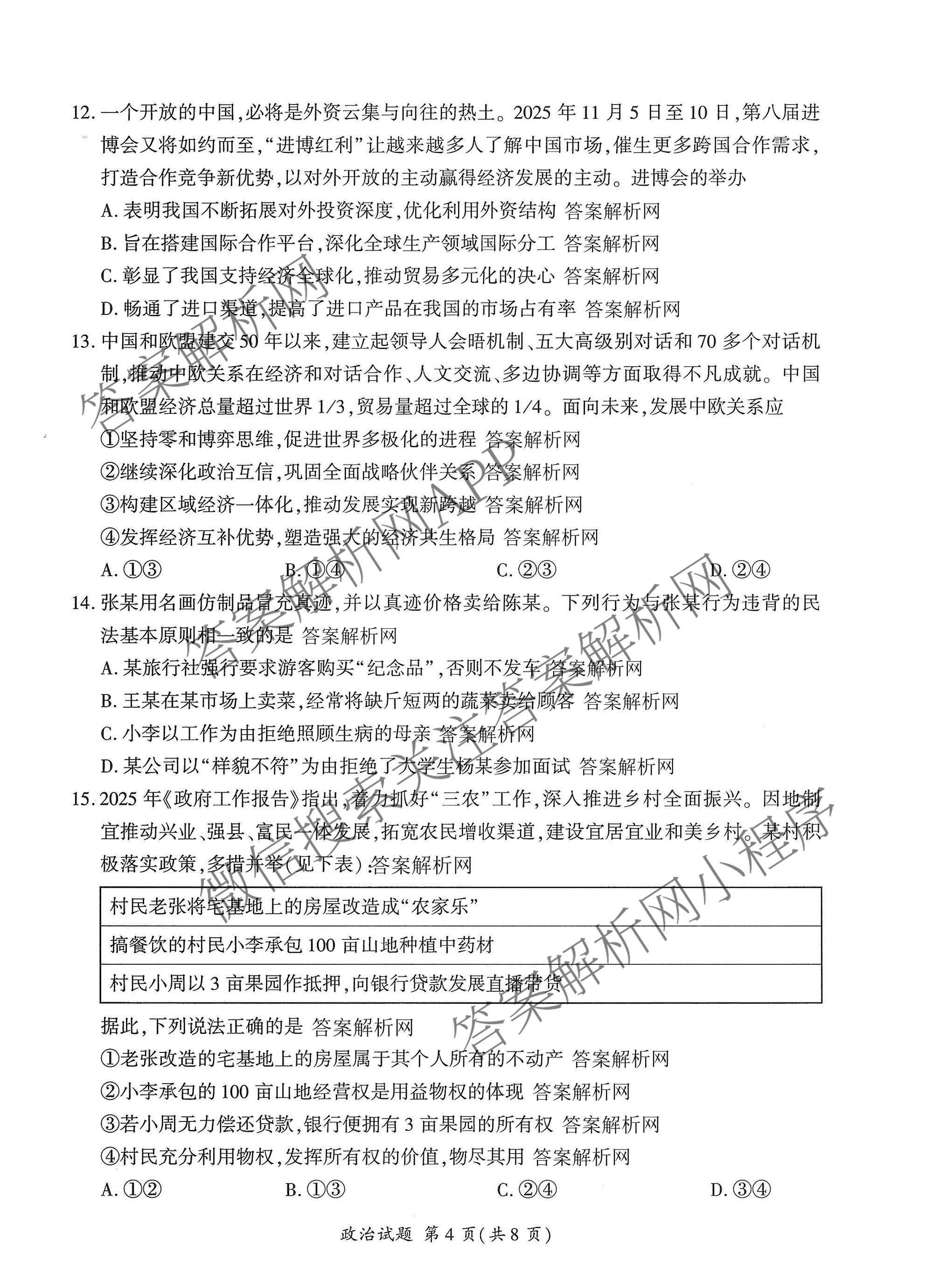 - 2025~2026(百师联盟)学年(高二)上学期综合测试卷政治(75分钟)试题