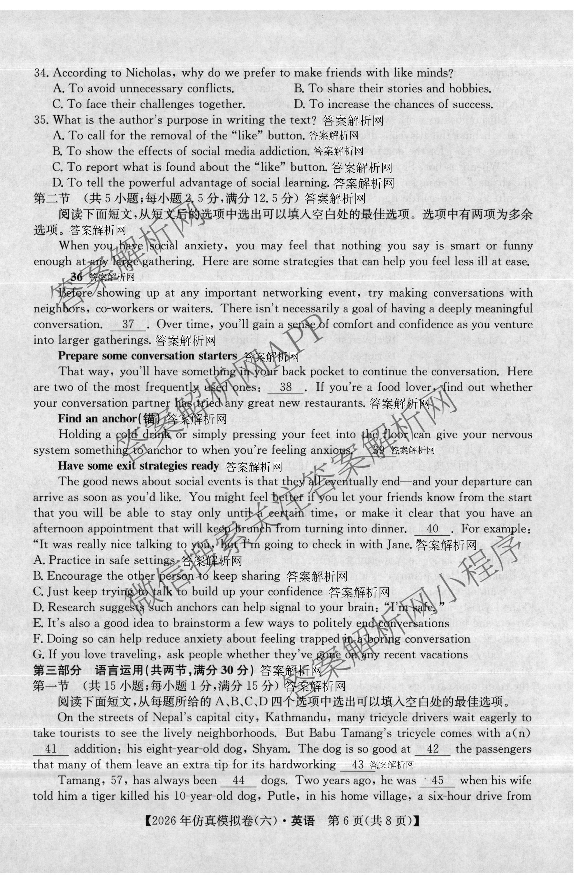 - [高三]2026年(全国高考仿真模拟卷)(六)6英语答案
