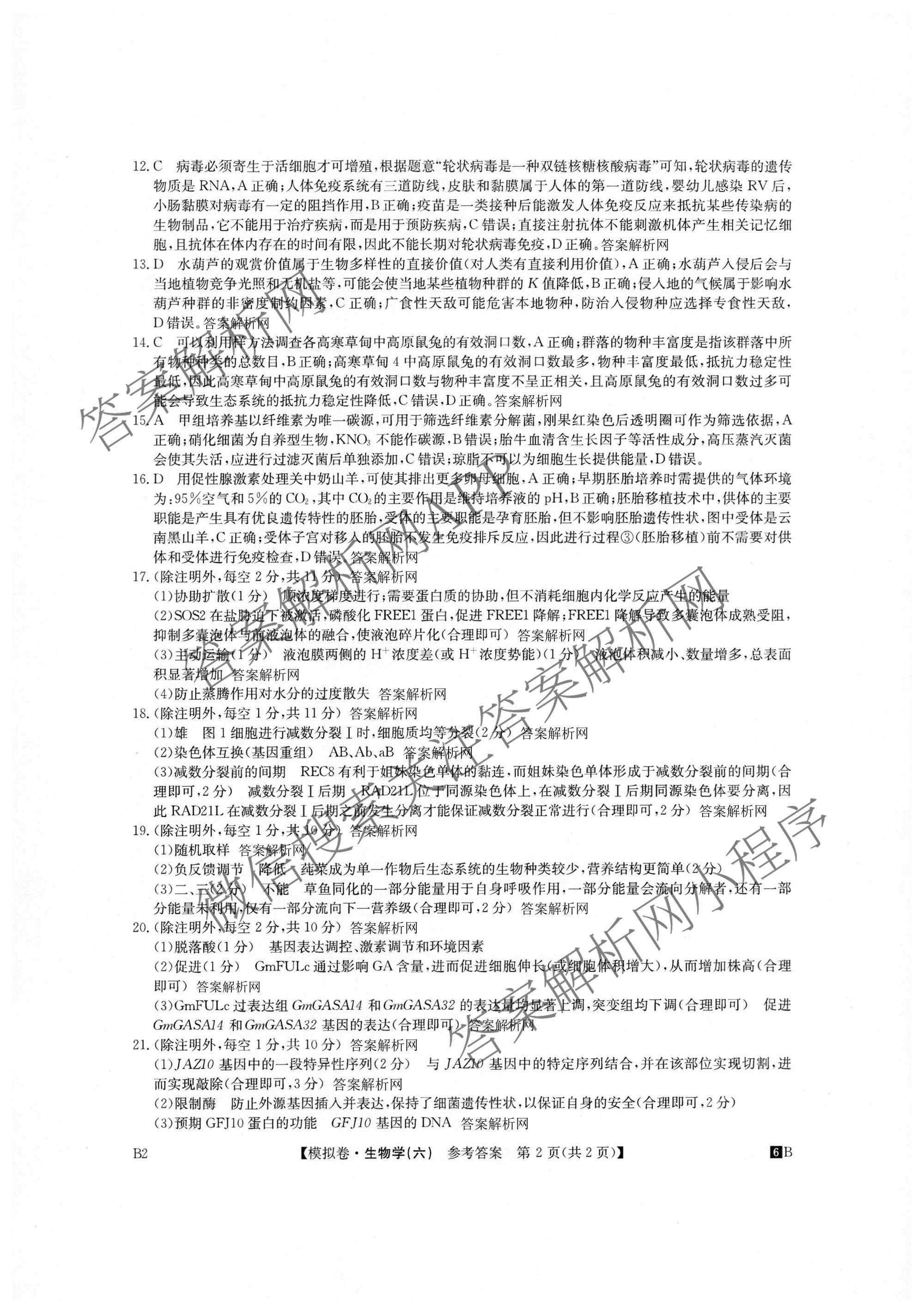- (高三)2026年[全国高考仿真模拟测试卷](六)6生物(B2)答案