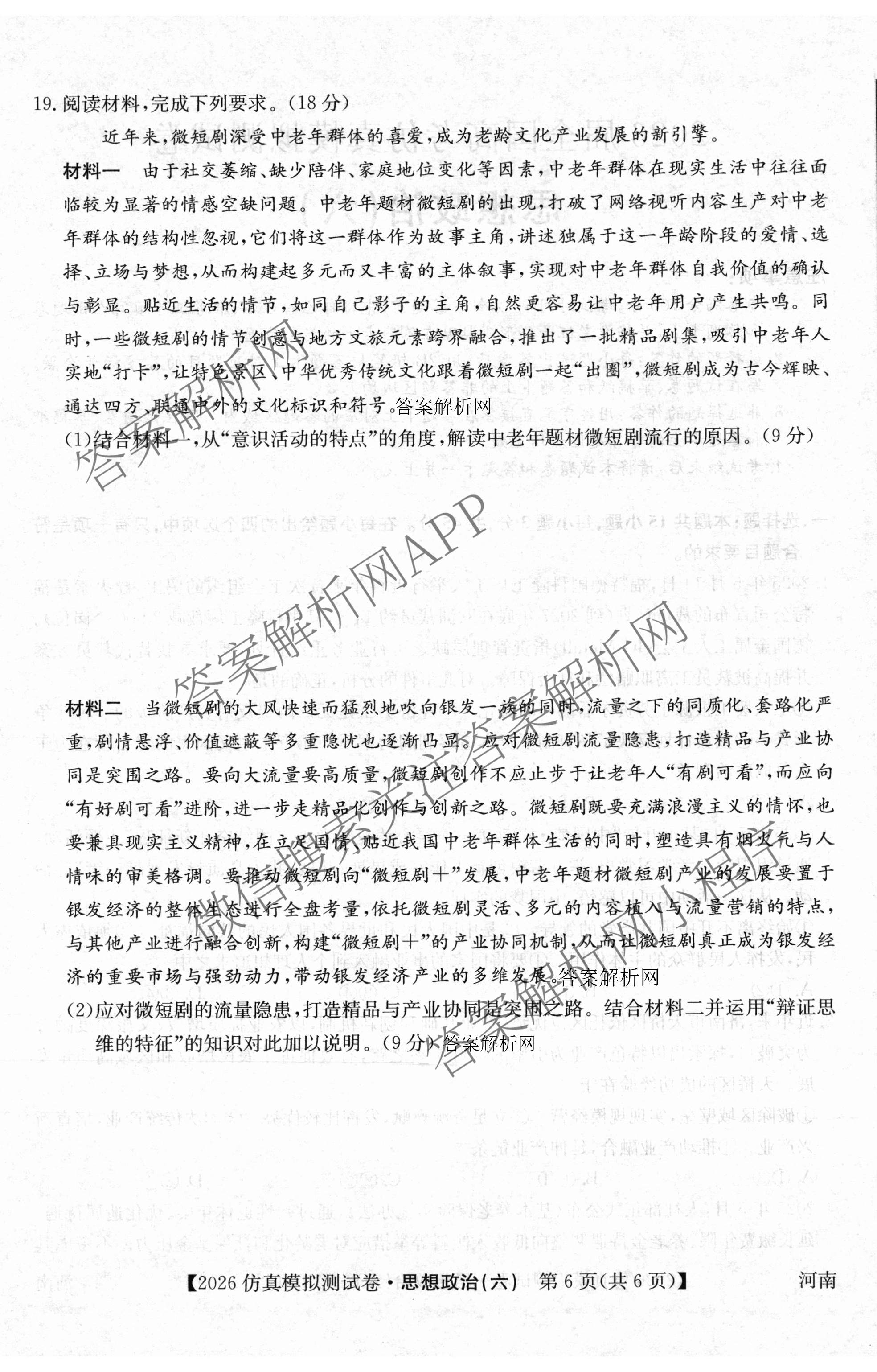 - 2026年全国高考仿真模拟测试卷(六)6政治(河南)答案