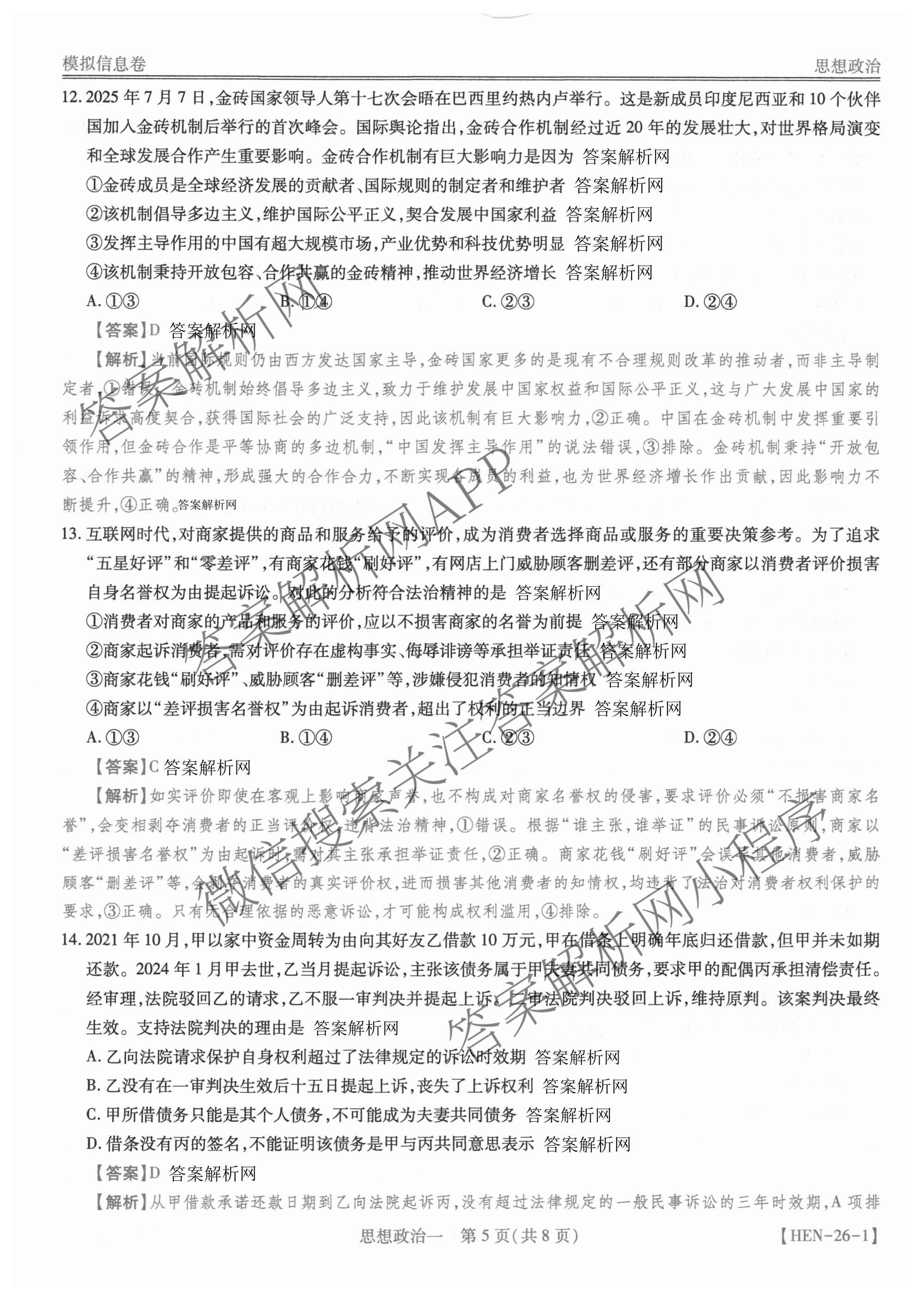 2026届[高考模拟冲刺预测训练](智慧上进)名校学术联盟高考模拟信息卷&冲刺卷&预测卷(一)1政治(HEN-26-1)(HEN)答案