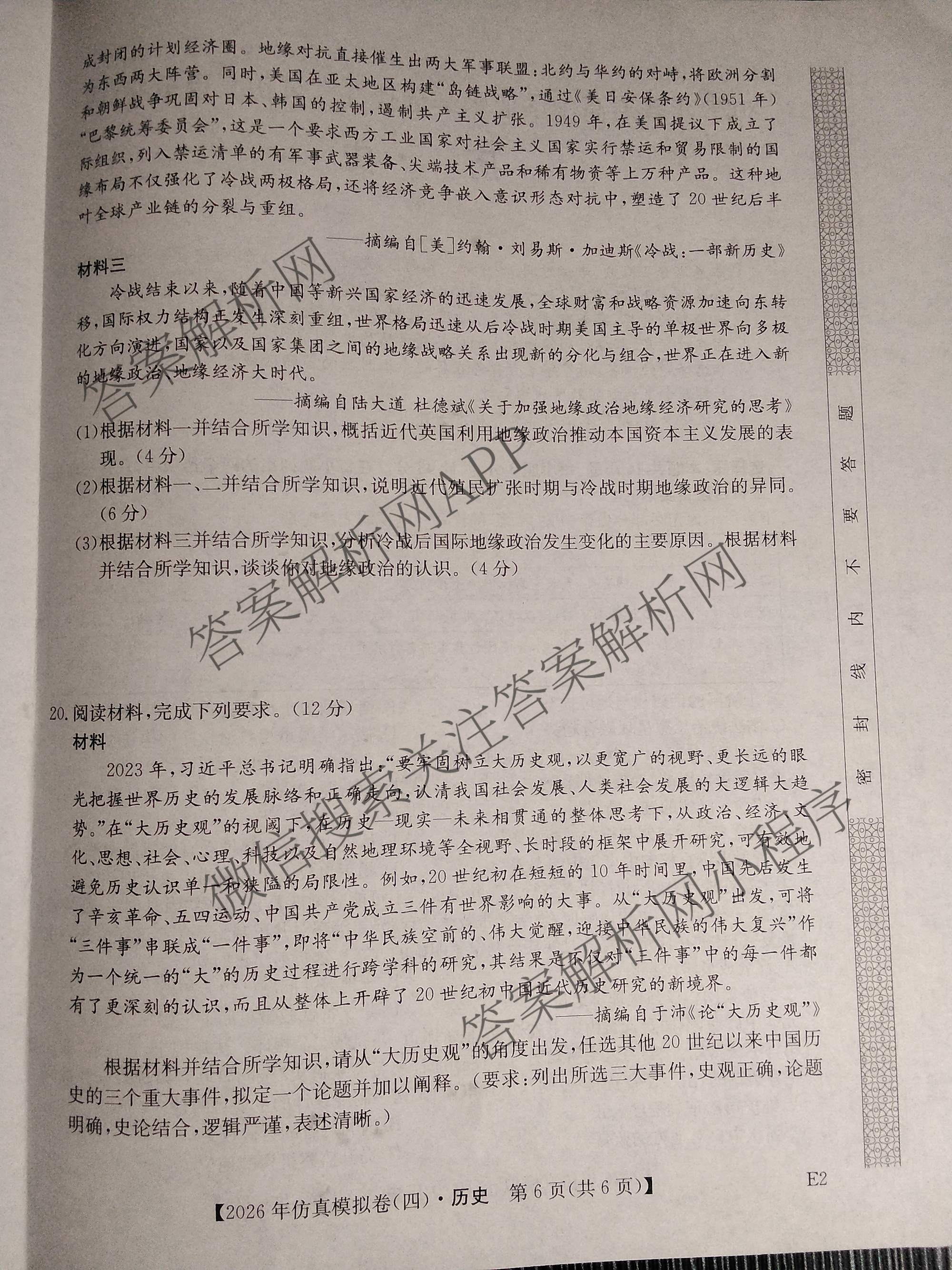 - (高三)2026年普通高中学业水平选择性考试仿真模拟卷(四)4历史(E2)答案