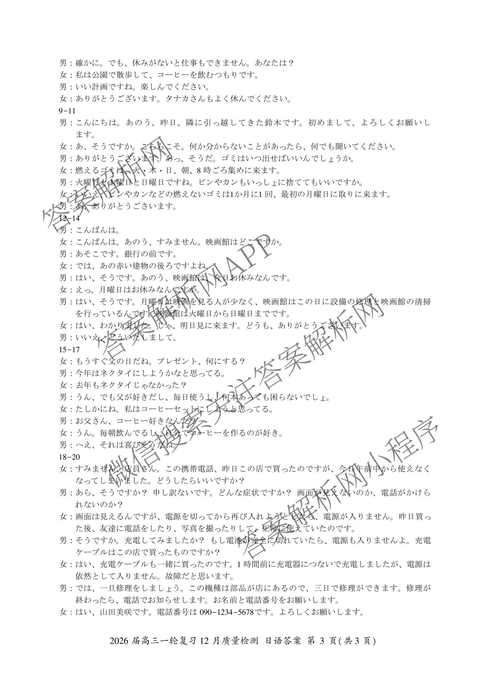- [高三]百师联盟2026届一轮复习12月质量检测(12.24)日语(百)答案