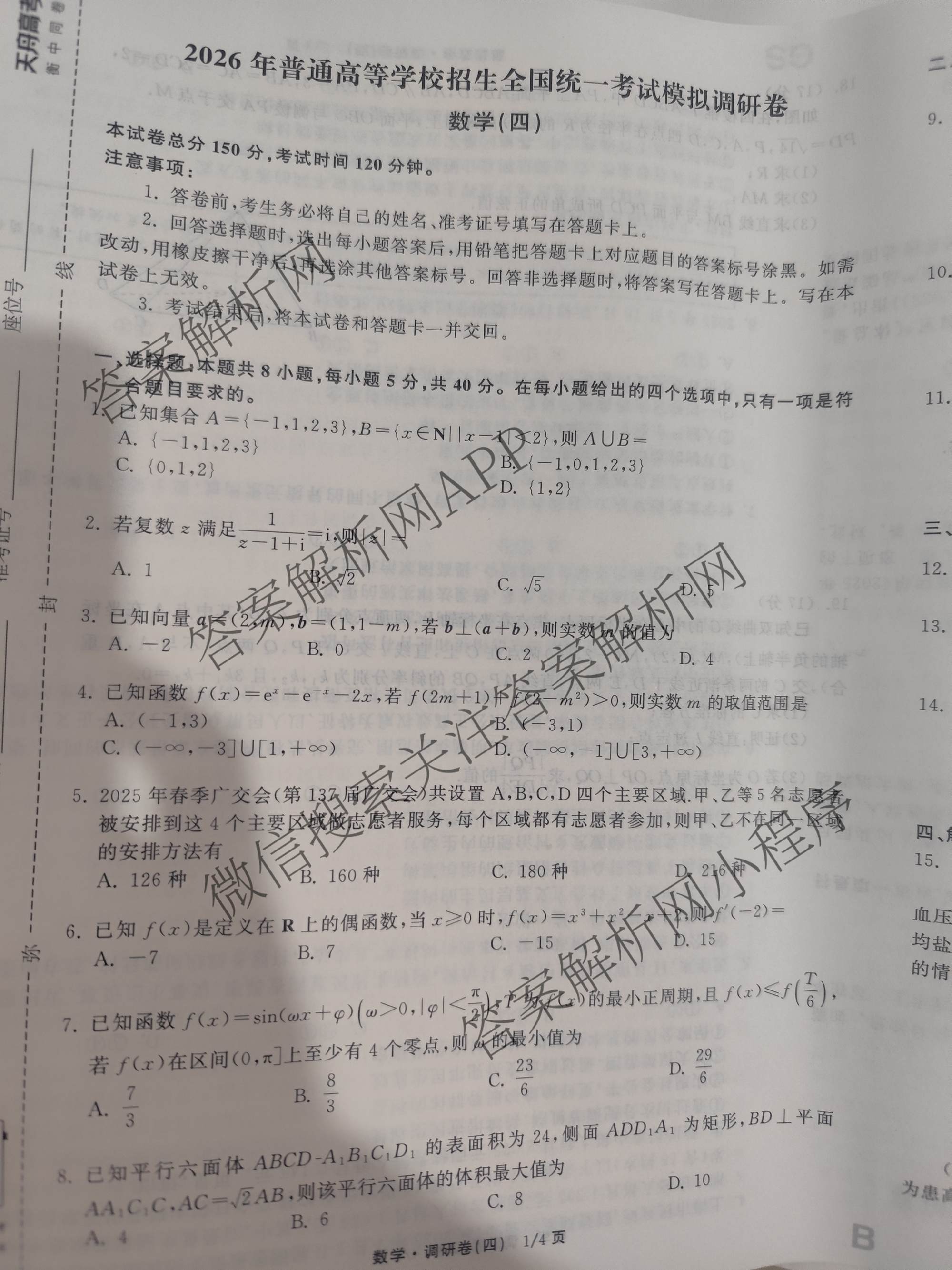 天舟高考衡中同卷·2026年普通高等学校招生全国统一考试模拟调研卷(四)4数学(B)试题,目前衡水金卷先享题答案网已经汇总了天舟高考衡中同卷·2026年普通高等学校招生全国统一考试模拟调研卷(四)4数学(B)试题的各科答案和试卷,获取更多衡中同卷答案解析,请在关注本站。