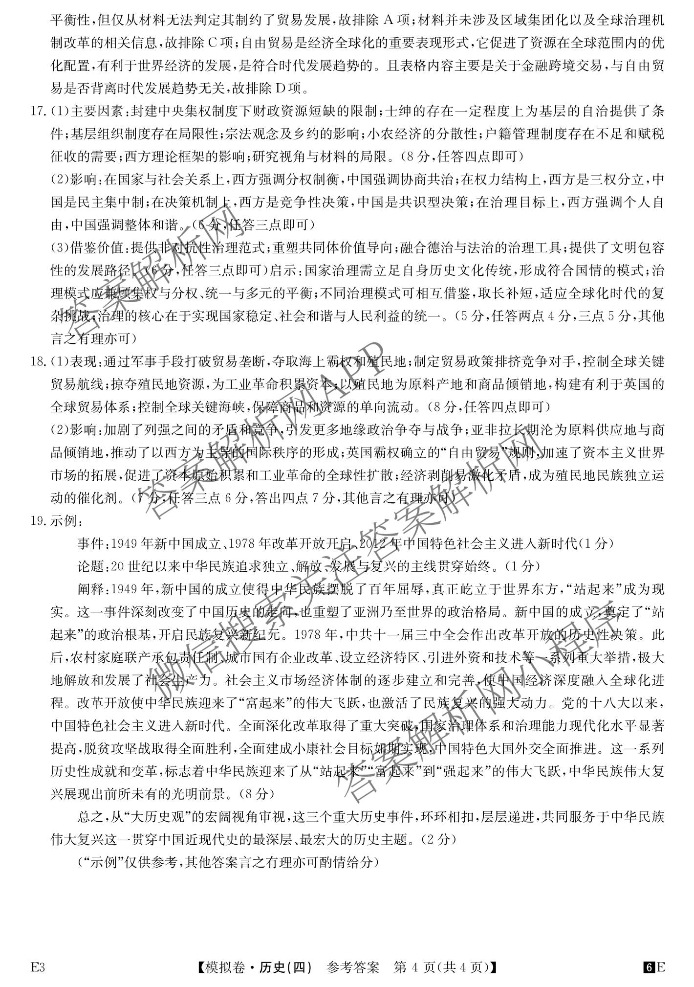 - [高三]2026年普通高中学业水平选择性考试仿真模拟卷(四)4历史(E3)答案