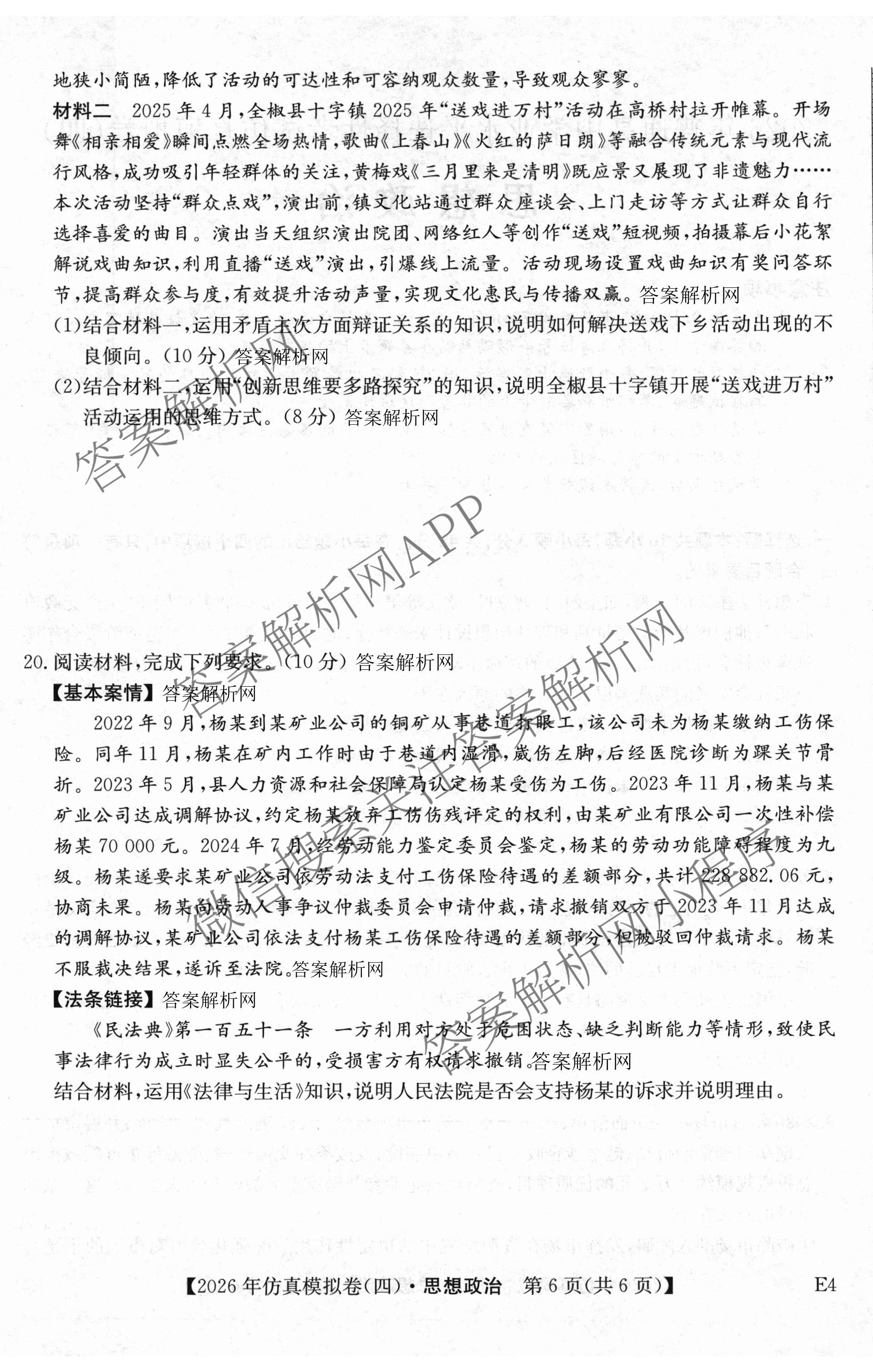 - [高三]2026年普通高中学业水平选择性考试仿真模拟卷(四)4政治(E2)答案