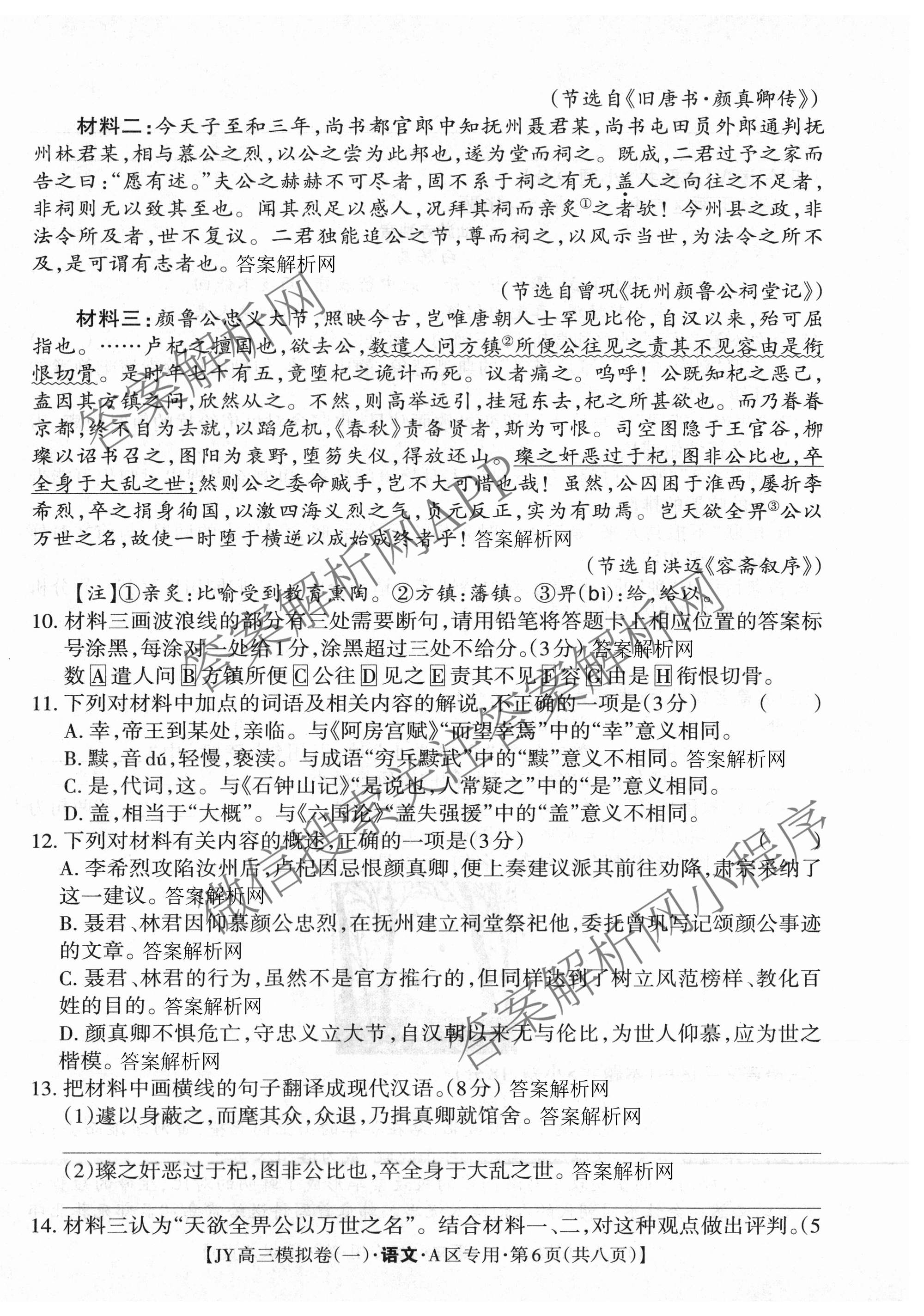 - [高三]2026年普通高等学校招生统一考试·JY模拟卷(一)语文(A区专用)答案