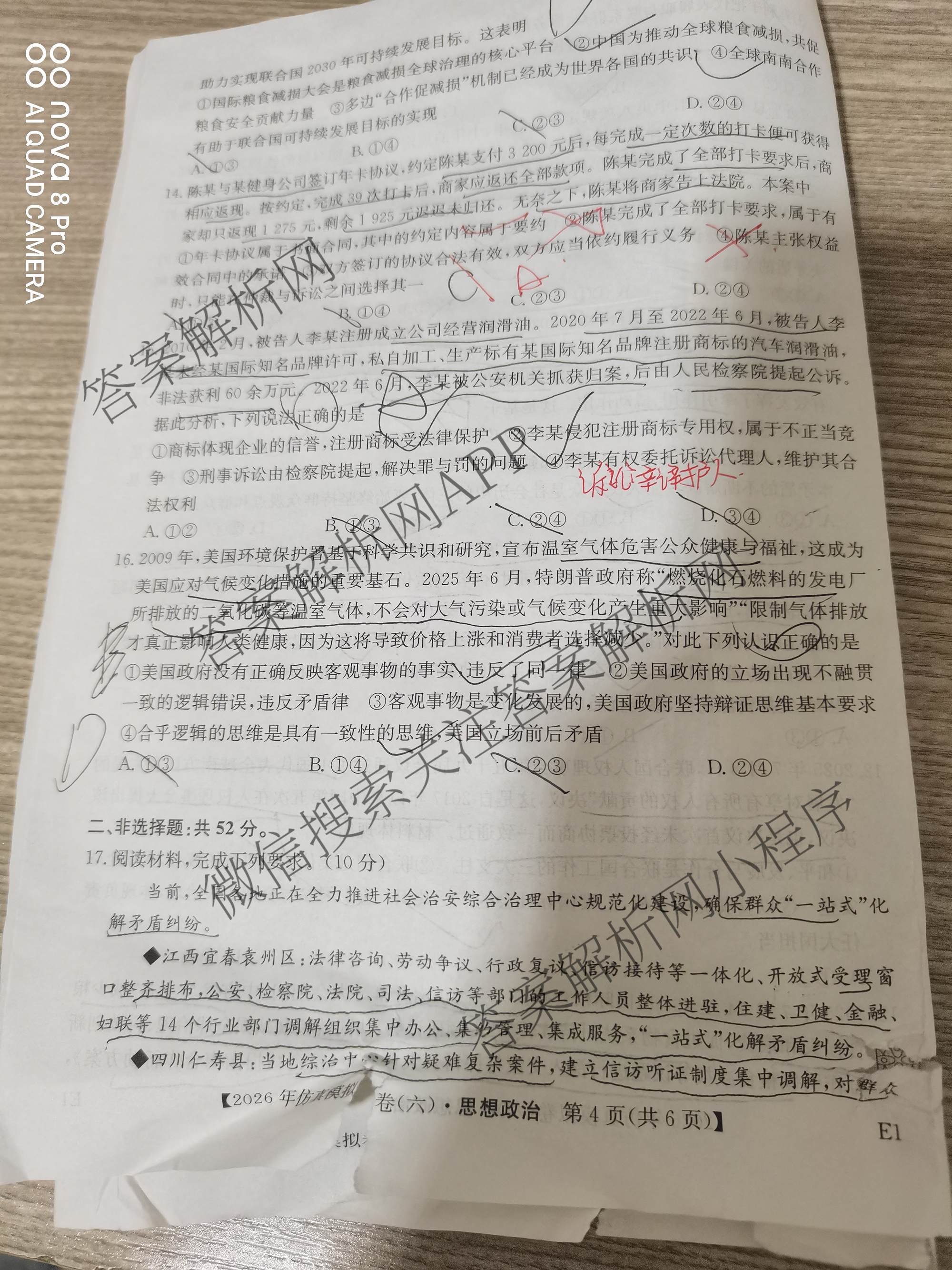 - [高三]2026年普通高中学业水平选择性考试仿真模拟卷(六)6政治(E4)答案