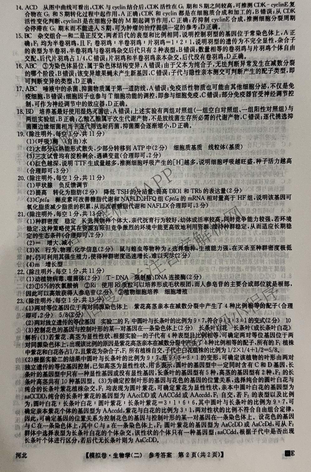 2026年普通高中学业水平选择性考试仿真模拟卷(二)2生物(河北)答案