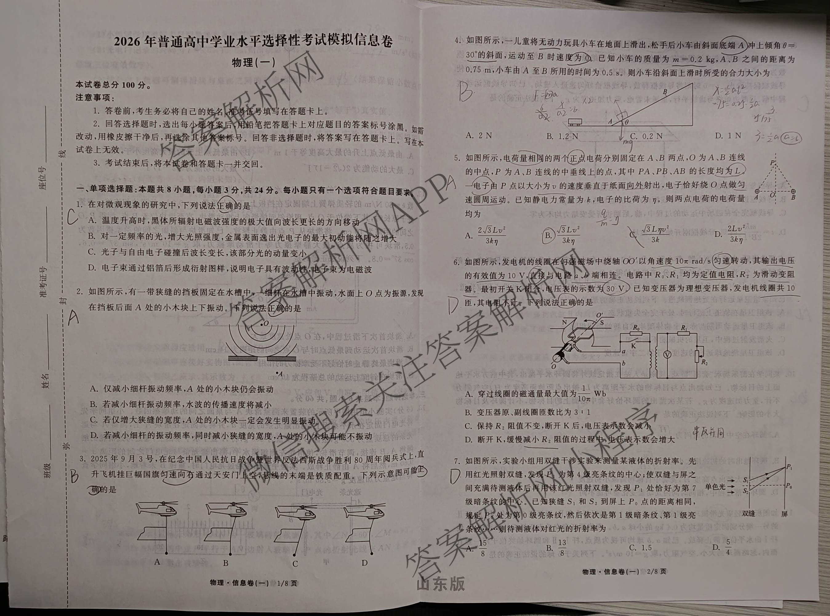 - 天舟高考(衡中同卷)·2026年普通高中学业水平选择性考试模拟信息卷(一)1物理(山东版)答案