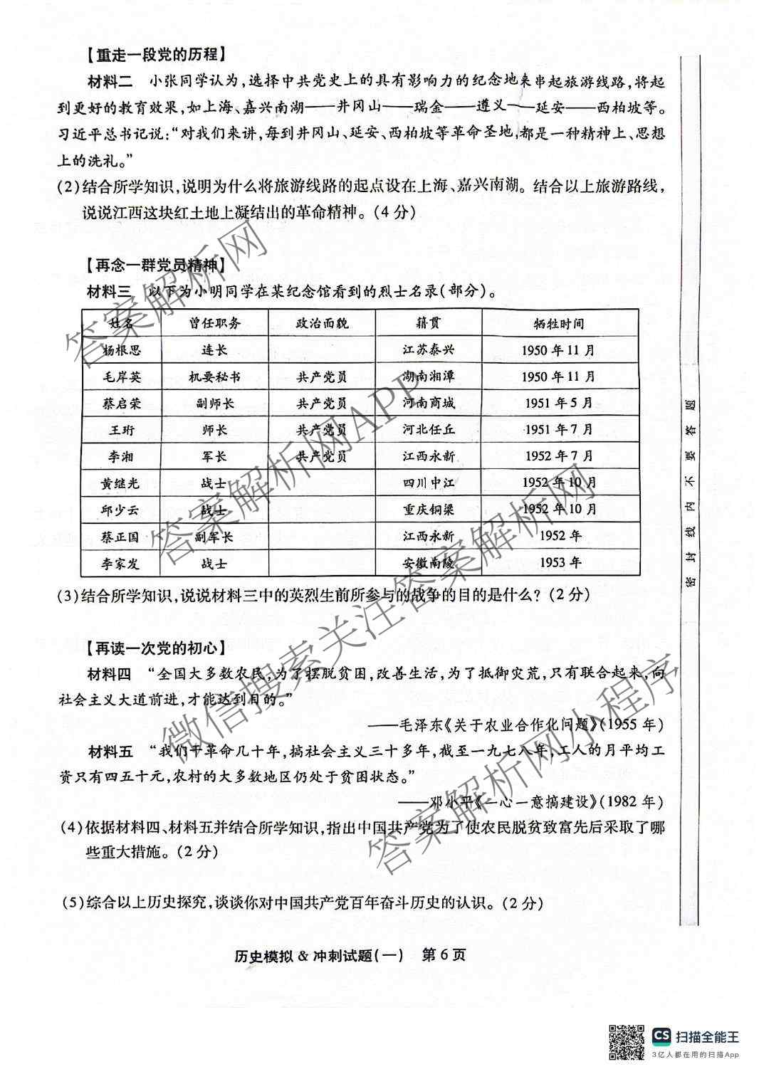 - 2024江西学考总复习猜想(九年级) 历史模拟&冲刺(一)答案