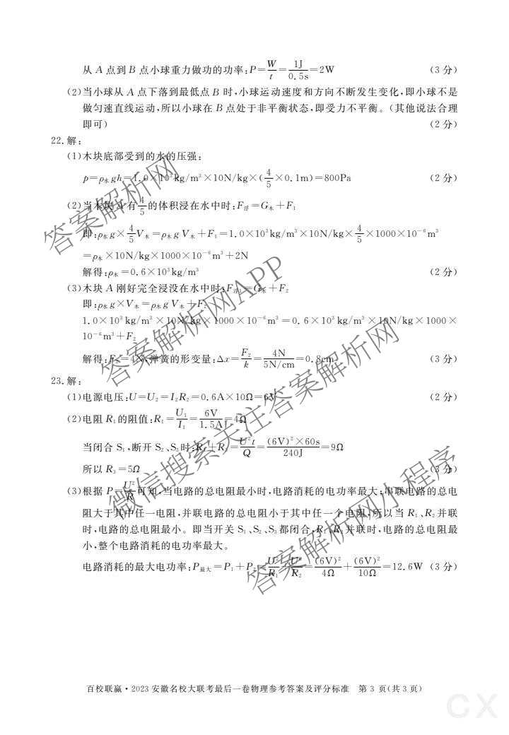 - 九年级[百校联赢]·2023安徽名校大联考最后一卷物理答案