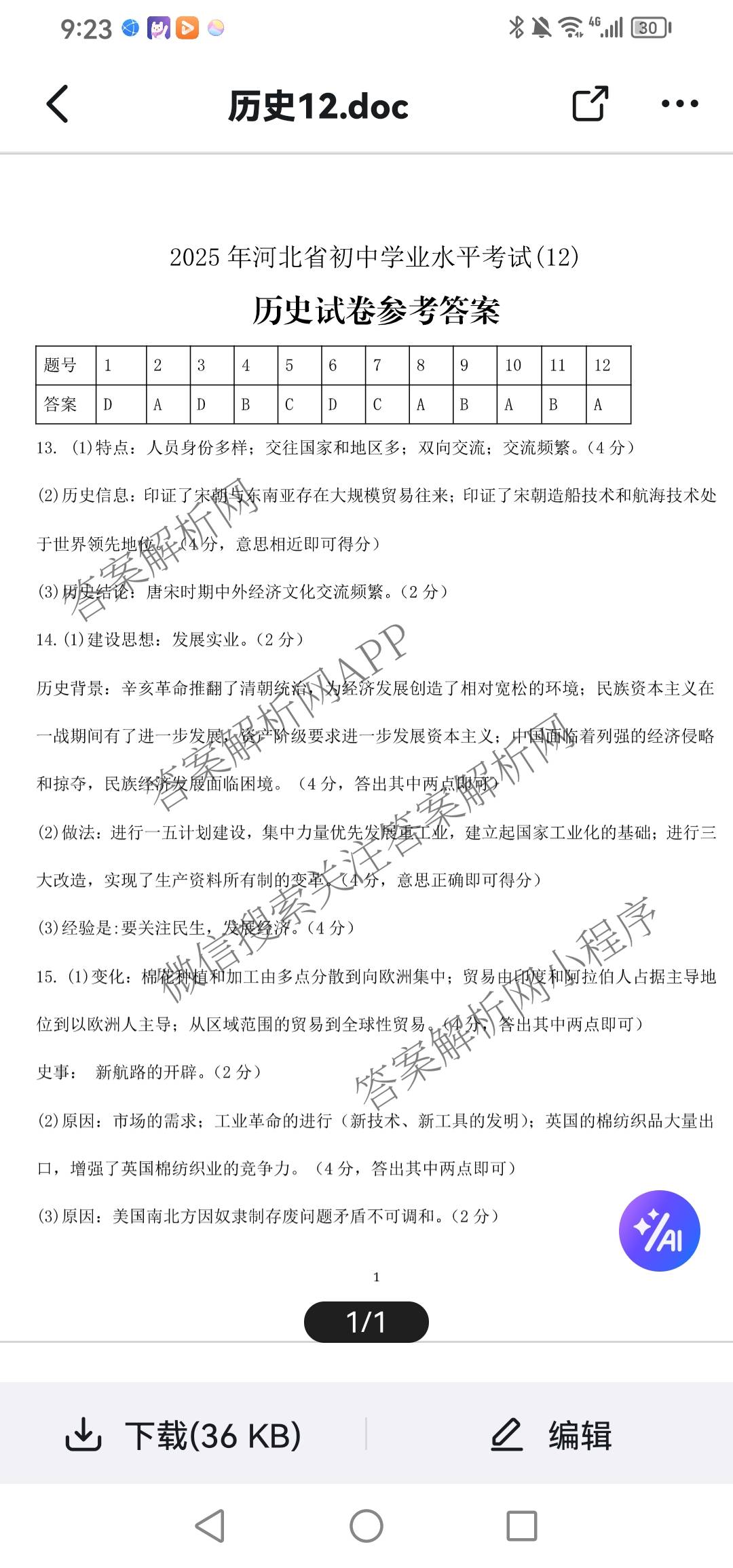 (九年级)2025河北省初中学业水平考试(12)历史答案