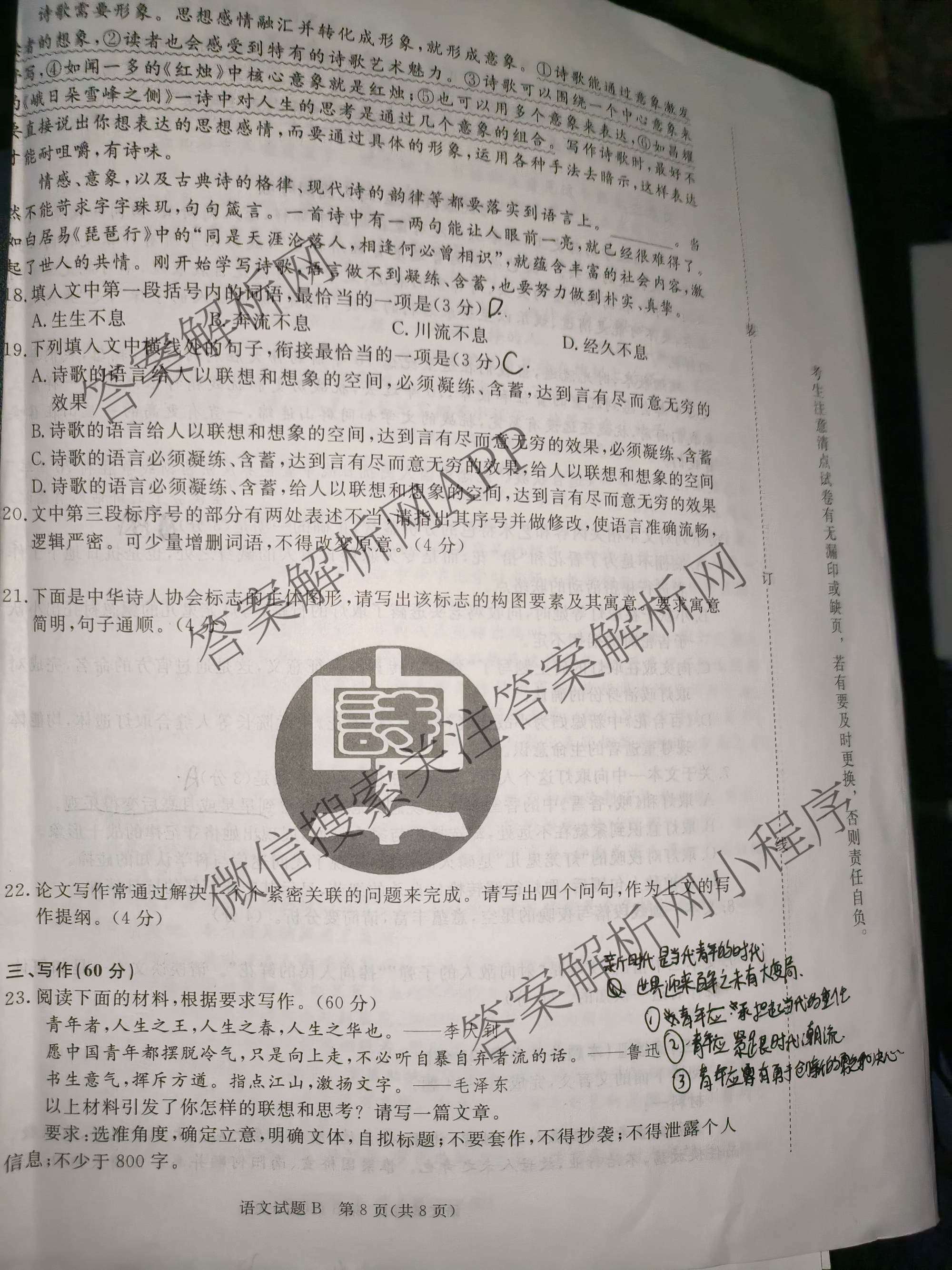 2028届普通高等学校招生全国统一考试·青桐鸣大联考(高一)(10.14-15)语文(B)试题,目前衡水金卷先享题答案网已经汇总了2028届普通高等学校招生全国统一考试·青桐鸣大联考(高一)(10.14-15)语文(B)试题的各科答案和试卷,获取更多桐鸣卷答案解析,请在关注本站。