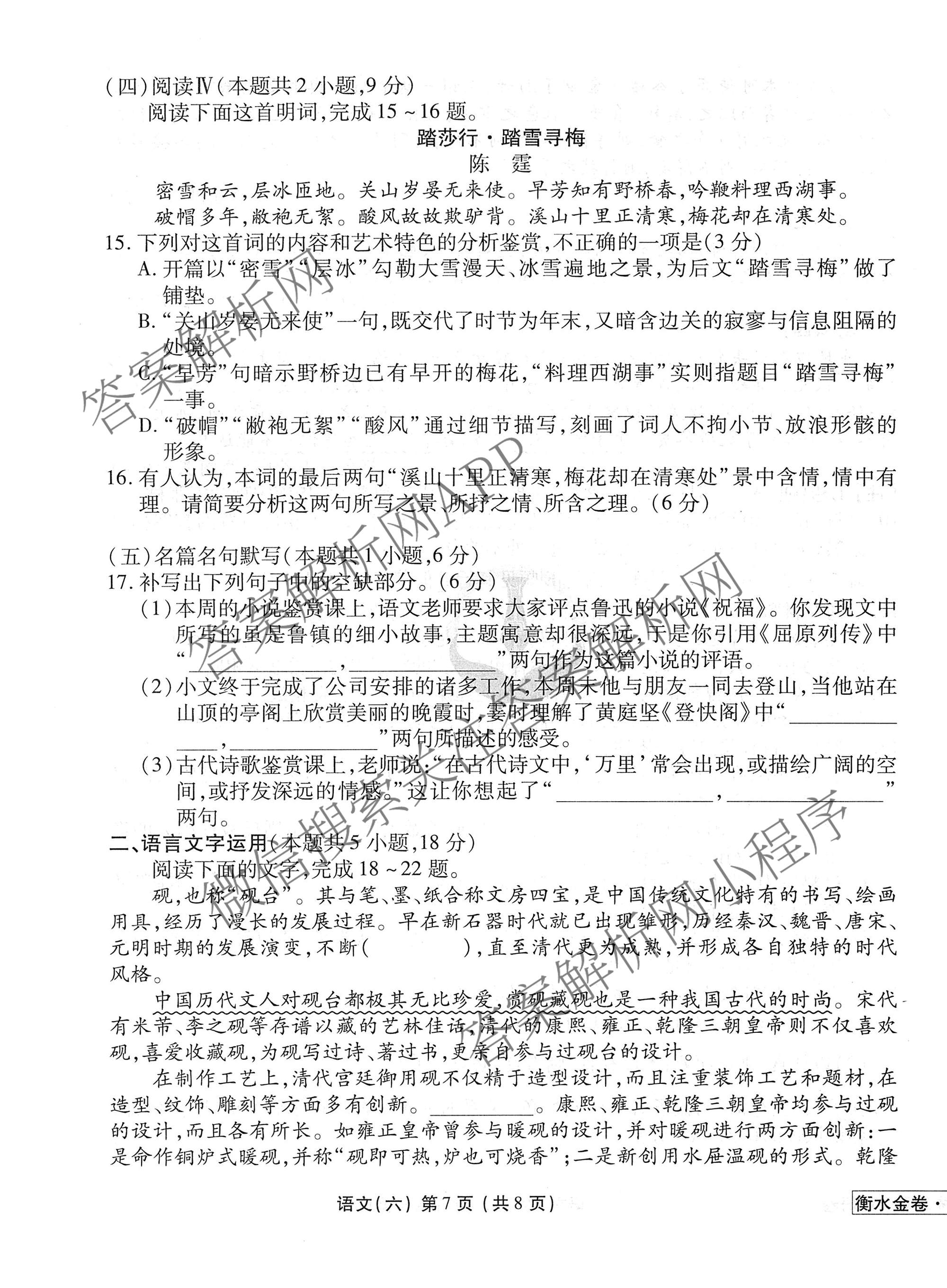 衡水金卷先享题·调研卷·2026年普通高等学校招生全国统一考试模拟试题(六)6语文试题,目前衡水金卷先享题答案网已经汇总了衡水金卷先享题·调研卷·2026年普通高等学校招生全国统一考试模拟试题(六)6语文试题的各科答案和试卷,获取更多衡水金卷先享题答案解析,请在关注本站。