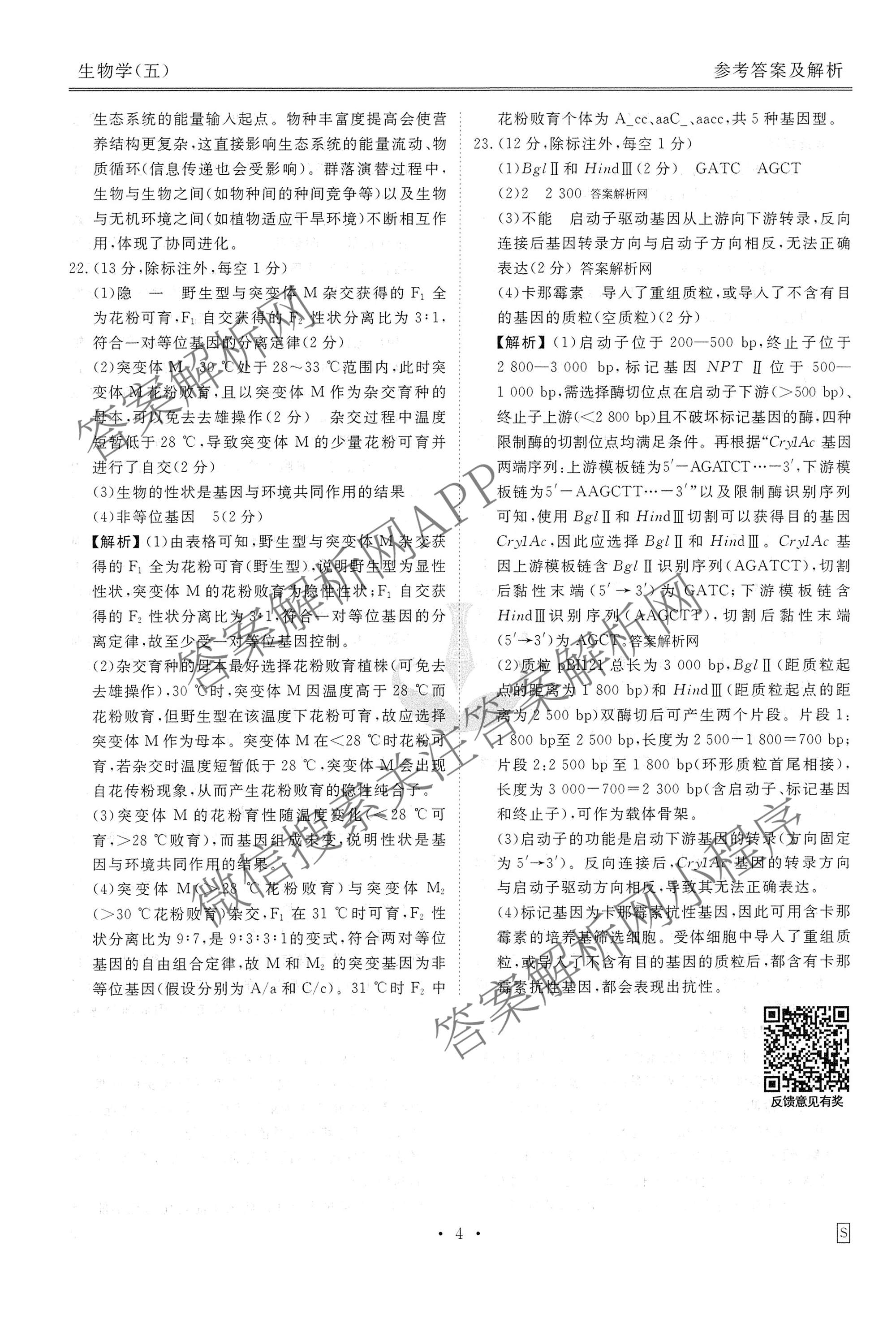 衡水金卷先享题调研卷2026年普通高中学业水平选择性考试模拟(五)5生物(S)答案