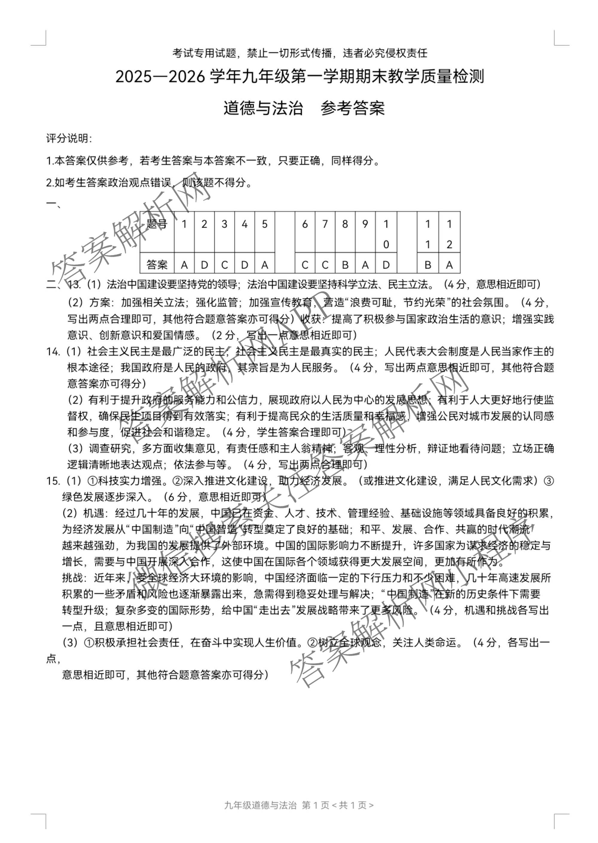 - 思博河北省2025~2026学年(九年级)第一学期期末教学质量检测道德与法治答案