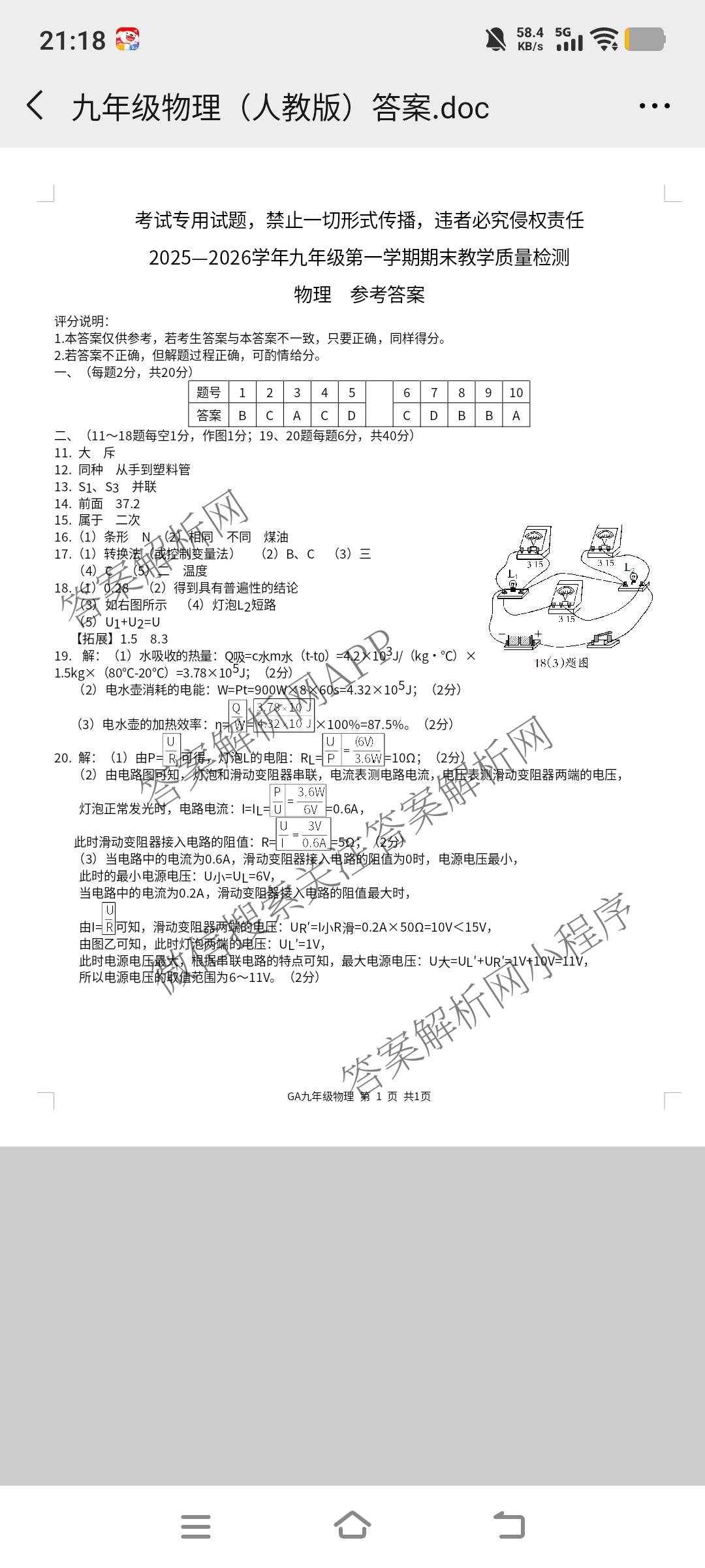 - 2025~2026思博河北省学年[九年级]第一学期期末教学质量检测(C卷)物理(GA)答案