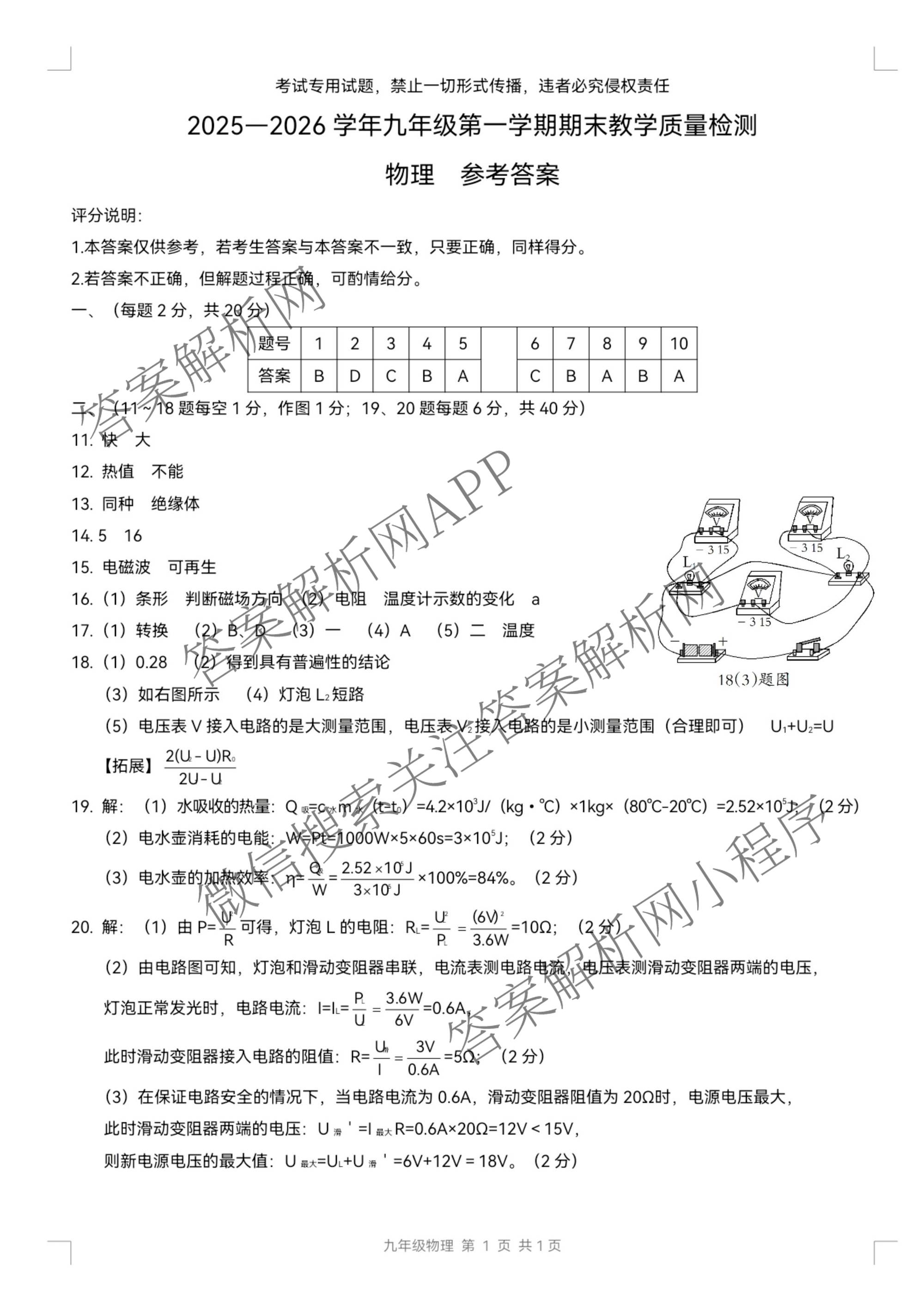 - 2025~2026思博河北省学年[九年级]第一学期期末教学质量检测(C卷)物理(GA)答案