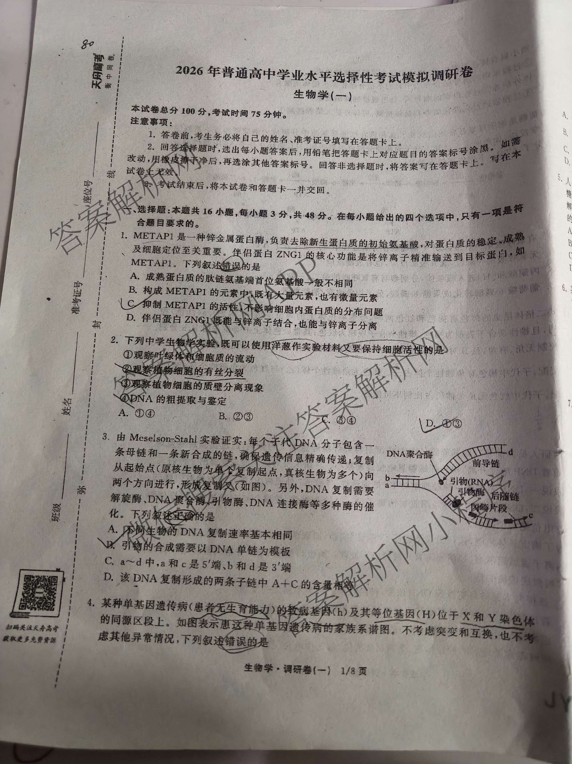- 高三天舟高考衡中同卷2026年普通高中学业水平选择性考试模拟调研卷(一)1生物试题
