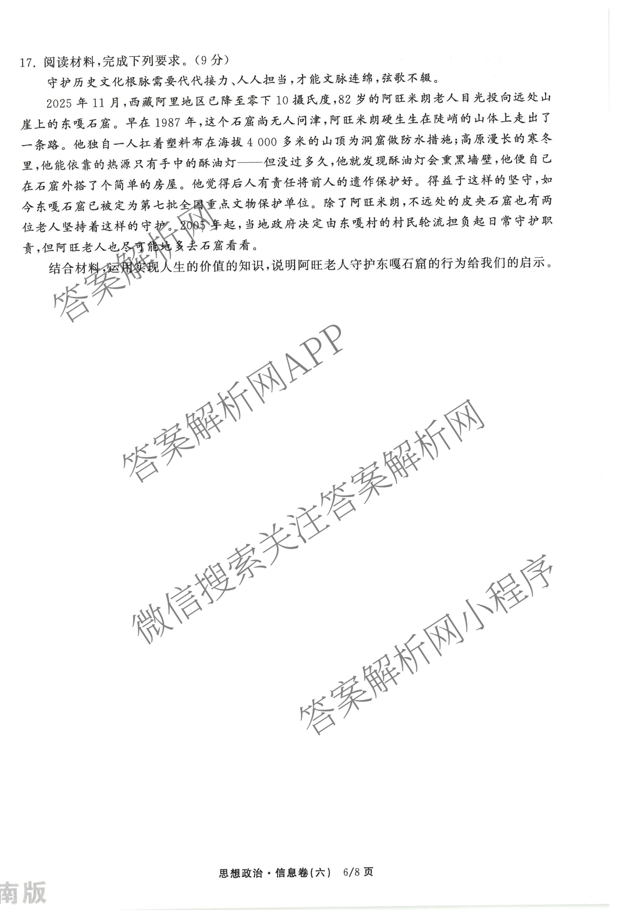 天舟高考(衡中同卷)2026年普通高中学业水平选择性考试模拟信息卷(六)6政治(河南版)试题